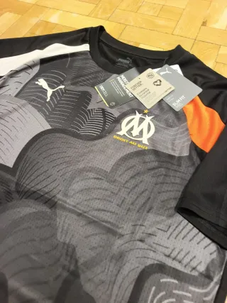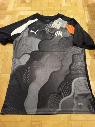 Camiseta de entrenamiento del Olympique de Marsella, con un diseño moderno y llamativo. - Tejido con tecnología Drycell para una óptima gestión de la humedad. - Detalles en blanco y naranja. - Escudo del club y logo de Puma bordados Camiseta de entrenamiento de futbol de la marca Puma y del equipo Olympique de Marsella totalmente nueva a estrenar con sus etiquetas originales color negro. Es una talla L ceñida estilo futbol. Producto 100% original y oficial.