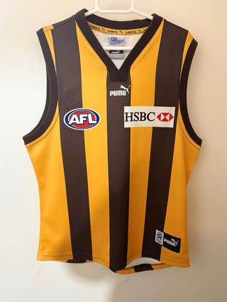 Camiseta oficial de la AFL (liga australiana) del equipo Hawthorn Hawks, modelo On Field de Puma. Producto original con licencias oficiales AFL. Fabricada en Australia. Camiseta sin mangas, ideal para colección, deporte o fans del fútbol australiano. Detalles: • Equipo: Hawthorn Hawks • Marca: Puma • Liga: AFL • Talla: L • Material: 100% poliéster • Fabricada en Australia Medidas: • Largo (hombro a cintura): 70 cm • Ancho (axila a axila): 55 cm Buen estado general, sin rotos ni manchas.