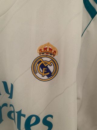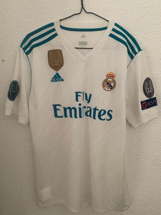 Camiseta de fútbol del Real Madrid de la temporada 2017. - Diseño clásico blanco con detalles en verde azulado. - Escudo del club y logo de Adidas bordados. - Parche de campeón del mundo FIFA 2017. - Insignia de la Champions League. - Patrocinador principal Fly Emirates impreso.