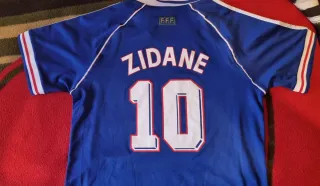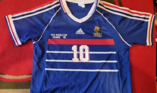 Camiseta de fútbol de la selección de Francia, edición especial Copa del Mundo 1998, con el dorsal 10 de Zinedine Zidane. - Diseño icónico con los colores de la bandera francesa. - Detalles de la Copa del Mundo FIFA 1998. - Logo de Adidas bordado.