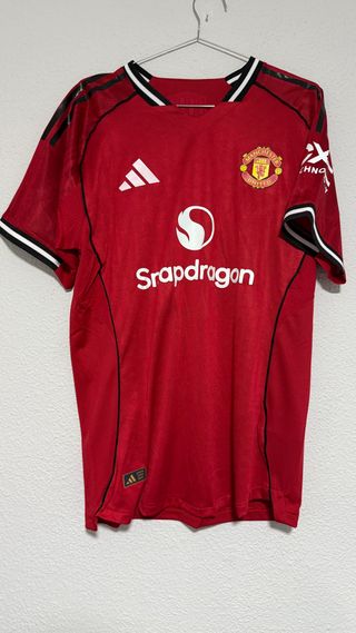 Camiseta de fútbol del Manchester United. - Diseño clásico en color rojo. - Detalles en negro y blanco en cuello y mangas. - Logo de Adidas y escudo del club. - Sponsor Snapdragon en el frontal 📦 Envío disponible a toda España (rápido y bien protegido). 📍 También posibilidad de entrega en mano en Madrid Centro. 💰 Precio fijo, ahorrémonos el tiempo. Gracias por entender.