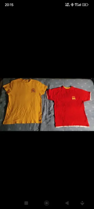 Pack de dos camisetas de la selección española de fútbol. - Una camiseta es de color amarillo con el escudo en el pecho y las letras ESPAÑA detrás y en rojo. - La otra camiseta es de color rojo con una linea blanca en las mangas y cuello y las letras ESPAÑA detras y en amarillo. Ambas están poco usadas, que aunque antiguas, guardadas mucho tiempo