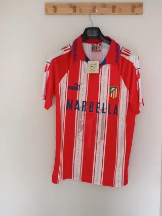 Camiseta de fútbol retro con la publicidad mítica de Marbella y el nombre y dorsal del cholo Simeone. - Talla L en etiqueta pero da talla como una M - Diseño a rayas rojas y blancas. - Logo de Puma en el pecho.