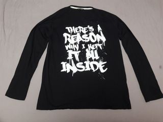 Camiseta negra de manga larga con estampado blanco con texto There's a Reason Why I Kept It All Inside. - Estampado blanco con texto There's a Reason Why I Kept It All Inside. - Cuello redondo. - Talla L.