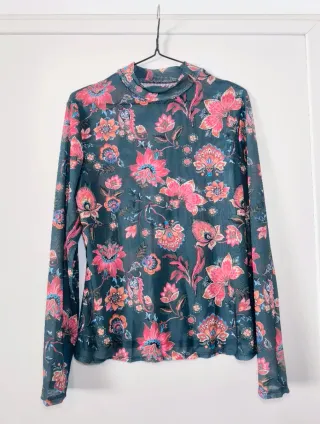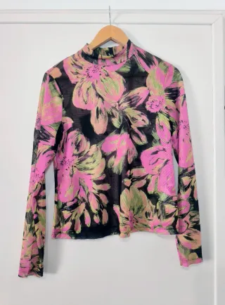 Camiseta de malla, manga larga, semi transparente, talla L, estampado de flores, cuello alto. - Nuevo a estrenar ✨ - 63 de largo, 50 de hombros y 46 de axilas. #top #vintage #malla #camiseta #floreada #cropped #blusa #bohemio #bohochic