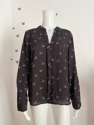 Elegante blusa negra con estampado floral multicolor. Ideal para un look sofisticado y elegante. De la marca: Primark // Talla: XL-L - Diseño con cuello mao y abertura en V. - Mangas largas. - Tejido ligero y fluido.