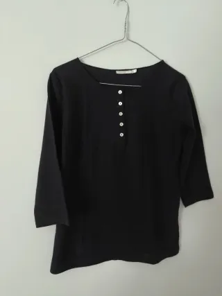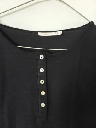 Camiseta de Women's Secret de manga tres cuartos con un toque de lurex. - Cuello redondo. - Cierre de 5 botones nacarados en la parte delantera (1 botón de repuesto en etiqueta). - Detalle sutil de lurex haciendo rayas verticales. - Talla 40 (medidas: hombros 39cm, largo 61 cm). - Hecho en España. Más en mi armario. Sólo envío. #negro #noche #lurex #womenssecret #chicstyle
