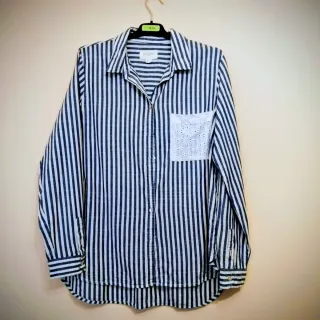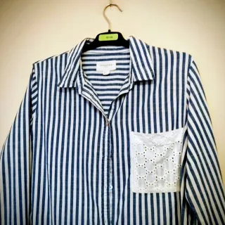 Camisa de manga larga con un diseño de rayas verticales en azul y blanco. Presenta un bolsillo en el pecho con detalle de encaje. - Cuello camisero. - Cierre de botones. - Puños abotonados.