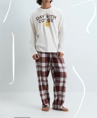 Pijama de Garfield, ideal para los amantes de este personaje. - Camiseta de manga larga blanca con estampado. - Pantalón de cuadros marrones y blancos.