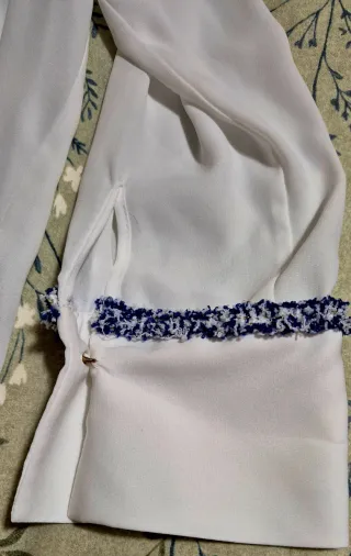 Elegante blusa blanca de Zara con un detalle de tejido tweed en azul marino en la zona del pecho. Perfecta para un look sofisticado. - Diseño de manga larga. - Cierre de botones. - Tejido ligero y fluido.