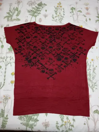 Usada dos veces. Camiseta granate / burdeos con detalles de calaveras y tibias en color negro,talla L, 95% viscosa 5% elastano. Estampado en frente y espalda. Es un tejido fino, suave y fresquito. Mide 64 cm. de ancho (de axila a axila) X 76 cm. de largo ( de hombro a cintura) aproximadamente. Manga al bies, cinturilla elástica. Marca Full Volume by EMP. #EMP #Fullvolume #calaverasyhueso #partesdearribamujer #camisetamangacorta