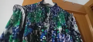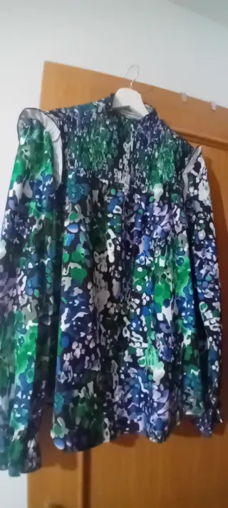Blusa con un llamativo estampado floral en tonos verdes y azules. Presenta un diseño con cuello alto y mangas largas.Puesta una vez - Cuello alto con fruncido. - Mangas largas con detalle en el puño. - Estampado abstracto floral.