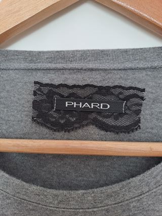 Camiseta gris manga larga de la marca Phard en la talla L. En perfecto estado. Tiene un detalle en la parte central delantera de corona con brillantitos en color gris más oscuro. Medidas 41cms de hombro a hombro, 46 cms de axila a axila y 59 cms de largo. Composición: 95% algodón y 5% elastano. Muy agradable. Un básico para poner con todo