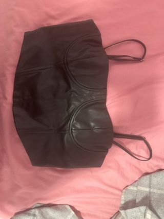 Top de efecto piel con un diseño moderno. - Material: efecto piel. - Corte: crop top. Top efecto piel talla L de Oysho - Estilo sencillo - tirantes anchos - escote redondo - top corto Pantalón wide leg a conjunto disponible en mi perfil