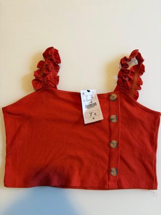 Top corto de Lefties. Naranja intenso. Tejido acanalado con elastano. Volantes en tirantes Medidas: Ancho 43cm Largo delantero 25 cm Largo espalda 19 cm Nuevo a estrenar