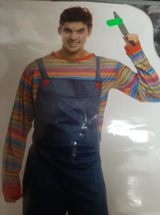 Disfraz de Chucky, el muñeco asesino, para Halloween o fiestas temáticas. Inspirado en el icónico personaje. - Incluye mono de tirantes y camiseta de rayas. - Ideal para recrear el look del personaje. - Talla M (equivalente a 38-40 / 48-50).