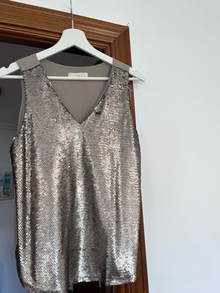 Blusa con detalles de lentejuelas. - Diseño sin mangas. - Acabado con lentejuelas en los laterales y bajo. - Talla: M/L - Usado una única vez