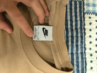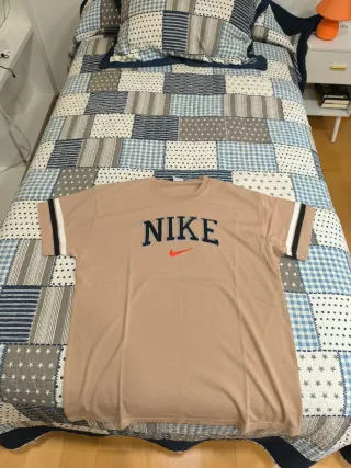 Camiseta de manga corta de la marca Nike en color marrón y talla L. Presenta un diseño clásico con el logo de la marca. - Mangas con detalles de rayas blancas y negras. - Logo de Nike en el pecho.