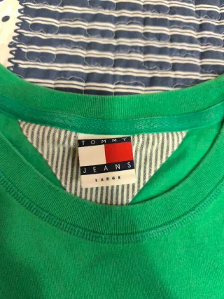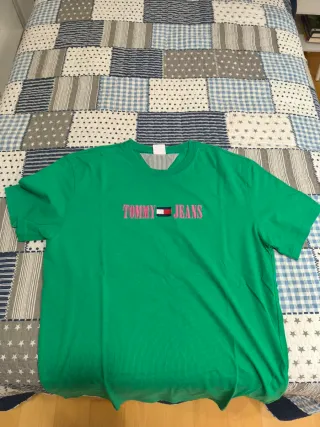 Camiseta de manga corta Tommy Hilfiger en color verde. Presenta un diseño con el logo de la marca en la parte delantera. - Logo Tommy Jeans con detalles en rosa y la bandera de Tommy Hilfiger. - Cuello redondo.