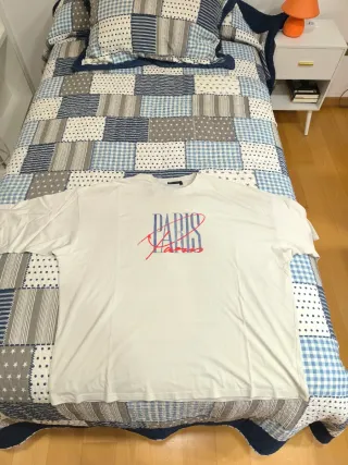 Camiseta blanca de corte oversize con un diseño gráfico en el pecho. - Diseño con texto PARIS y ARENAS. - Manga corta. - Cuello redondo.