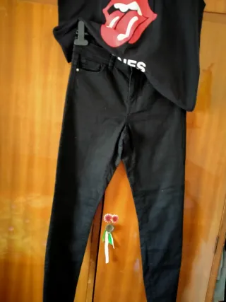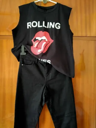Conjunto de camiseta con estampado de labios y pantalón de esta temporada prácticamente nuevos, camiseta sin estrenar y vaqueros puestos una vez -talla L - Camiseta negra con diseño de The Rolling Stones. -Vaqueros elasticos,finos.