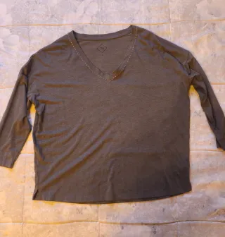Camiseta de manga 3/4 con un diseño elegante. - Cuello en V adornado con pequeñas tachuelas. - Tejido suave y cómodo. - Es talla S, pero es ancha, da hasta una L.