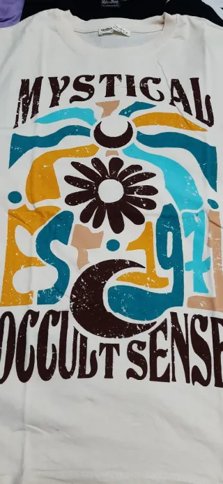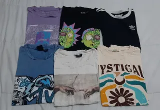 Conjunto de seis camisetas con diseños variados. - Camiseta morada con texto y palmeras. t/ M - Camiseta negra con estampado de Rick y Morty. t/ L - Camiseta negra Adidas. T/ 42 - Camiseta azul claro con diseño gráfico. - Camiseta crudo con imagen de La Creación de Adán. t/ M - Camiseta beige con estampado Mystical y diseño floral. t/ M