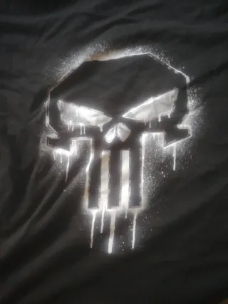Camiseta negra , nueva, talla L. con la iconica calavera en blanco y negro del Punisher. - camiseta 100% algodon -Diseño del Punisher. - Estampado con efecto spray y goteo, y ligero toque 3d.