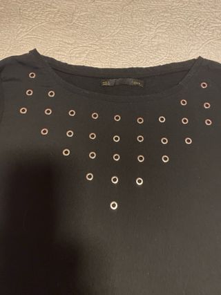 Camiseta negra de manga 3/4 con detalle de ojales metálicos en la parte delantera. - Diseño con ojales metálicos. - Manga 3/4.