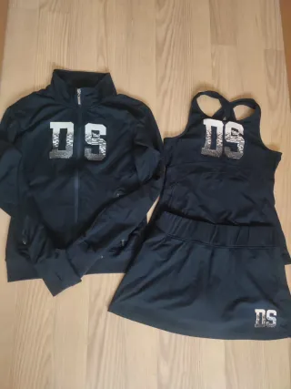 Conjunto deportivo de pádel para mujer de la marca Drop Shot. Incluye tres piezas. Material gordito y muy cómodo - Chaqueta deportiva con agujero en puño para el dedo talla L - Camiseta de tirantes cruzado en espalda talla L - Falda con pantalón interior en talla L.