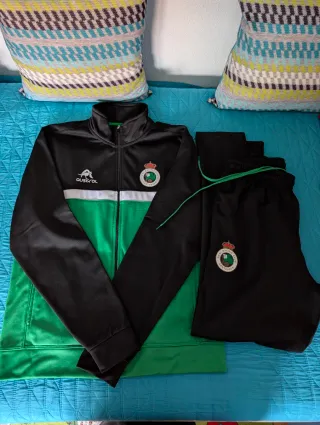 Conjunto de chándal completo del Racing de Santander de la temporada 23/24. Está como nuevo, se vende por tallar pequeño, como toda la ropa de Austral. Aún así, si no te gusta la ropa ancha y sueles usar una L, imagino que está será la talla. Pasa como con las camisetas, por dar referencia. Se puede valorar cambio por camiseta, sudadera chándal o similar del Racing.