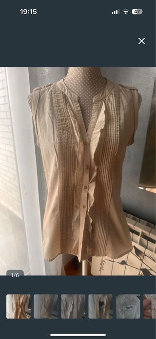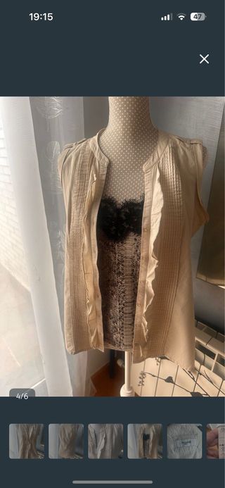 Blusa tipo chaleco de la marca Formula Joven. Camisa sin mangas, chaleco, blusa, color crudo, del Corte Inglés, talla 40 amplia. Mide 57 cm de sisas y 62 cm de larga. Como nueva, 1 uso. Puedes poner con top y camisetas debajo. 100% algodón, transpirable, ideal para tus viajes. Mucho más en mi perfil, liquido mi armario, muchas novedades y ofertas. - Diseño sin mangas. - Cierre de botones. - Detalles de volantes y plisados.
