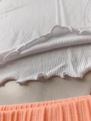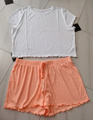 Conjunto de pijama La parte superior es de color blanco y la inferior naranja. Ribetes festoneados. Marca: Primark - Talla camiseta 42/44. Medidas en fotos. Estira. Su composición es de 95% viscosa, 5% elastano. - Talla pantalón 40/42. Medidas en fotos. Estira; el cordón es de adorno. Su composición es de 65% poliéster, 30% viscosa, 5% elastano. De tallaje te digo que si tienes la M, te está bien. Estado: NUEVO. Precio: 8€