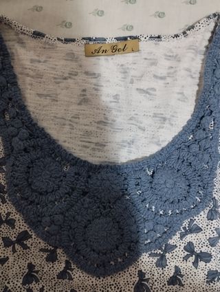 Camiseta con bordado de flores y letras plateadas. Lleva un cordón para ajustarlo en la parte de abajo. Talla L/XL. Buen estado