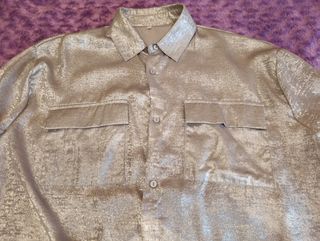 Preciosa camisa plateada, talla L. ✨ - Elegante diseño. - Botones funcionales. - Dos bolsillos de parche.