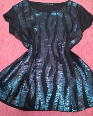 Camiseta de la marca Dandara con un diseño llamativo. Perfecto para eventos o salidas. - Diseño con lentejuelas. - Mangas cortas. - Corte recto. Talla L