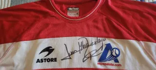 Camiseta de pelota a mano con firma. - Diseño con franja horizontal blanca y detalles rojos. - Logo de Astore en la parte frontal. - Firma de Juan Martinez de Irujo en la zona central.