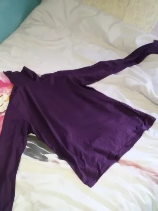 Elegante camiseta de manga larga y cuello alto (tipo cisne) en color morado intenso de la marca Festa. Es una prenda muy cómoda y elástica gracias a su composición con viscosa y elastano, ideal para llevar sola o debajo de jerséis y americanas en invierno. El tejido tiene una caída suave y no es rígido. Marca: Festa Moda S.L. Talla: 48 (ver etiqueta en fotos). Color: Morado / Púrpura. Composición: 62% Poliéster, 34% Viscosa, 4% Elastano. Estado: En muy buen estado, bien cuidada.