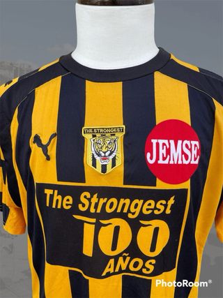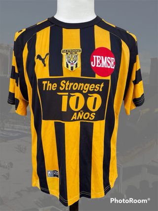 Camiseta de fútbol del equipo The Strongest de Bolivia, conmemorativa de sus 100 años, de la temporada 2008, excelente estado en talle M. Original de la época. - Diseño a rayas verticales negras y amarillas. - Logo de Puma en el pecho. - Escudo del equipo. - Inscripción The Strongest 100 Años en grande. - Círculo rojo con JEMSE en el pecho.