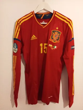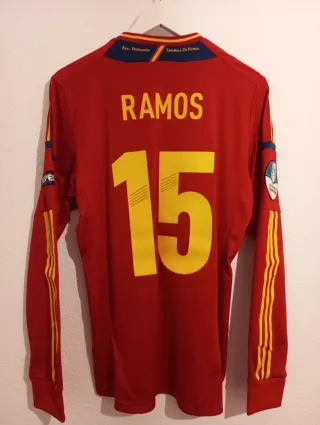 Camiseta de la Selección Española de fútbol Final Euro 2012,Adidas,Formotion,manga larga,talla M.Ramos 15. - Diseño de manga larga. - Detalles de las tres franjas en las mangas. - Escudo de la RFEF bordado en el pecho. - Número 15 en la parte frontal. - Parches de Campeones de Europa 2008 y 1964 en el cuello. - Parche de Campeones de Europa 2012 en la manga. No cambio,solo venta.
