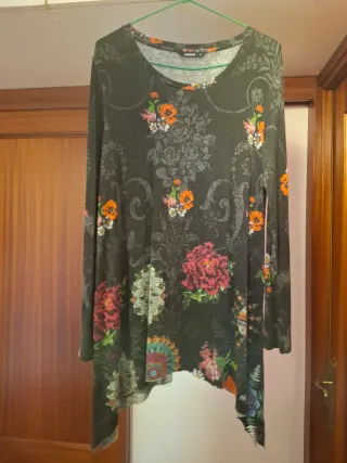 Camiseta larga con un llamativo estampado floral. - Diseño con manga larga. - Bajo asimétrico con caída. - Tejido suave y cómodo. Hay una foto para ver el estado de la tela.