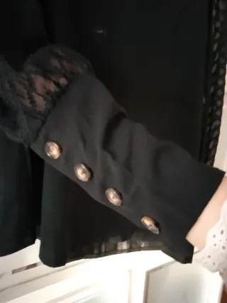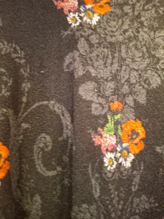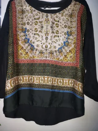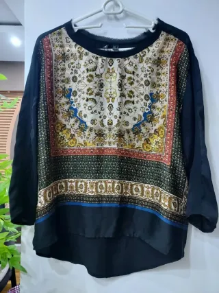 Preciosa blusa fluida de la marca H&M, con un elegante estampado de inspiración bohemia y oriental. La parte frontal tiene motivos multicolor muy refinados, mientras que las mangas y la espalda son de tejido negro ligero y ligeramente transparente, lo que le da un toque muy femenino y sofisticado. Detalles: • Marca: H&M • Talla indicada: S 👉 También puede servir para una M gracias a su corte fluido • Color: Negro y multicolor • Material: Tejido fluido, ligero y agradable al tacto • Ancho de sisa: 51 cm • Largo: 57 cm • Mangas: 3/4