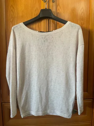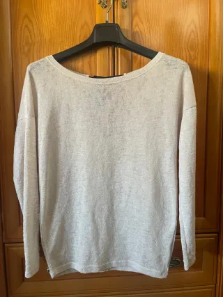 Vendo este precioso jersey de punto fino en color beige/crema. Es una prenda súper ligera, ideal para los días de entretiempo o para llevar con una lencera debajo. Tiene un corte relajado con los hombros caídos que queda ideal y favorece muchísimo. Estado: Muy buen estado, bien cuidado. Color: Beige arena (combina con absolutamente todo). Estilo: Escote tipo barco muy femenino. Tacto suave y ligeramente transparente para un toque sexy pero elegante. Combinación ideal: Queda increíble con unos jeans de tiro alto, una falda satinada o incluso encima de un vestido lencero.