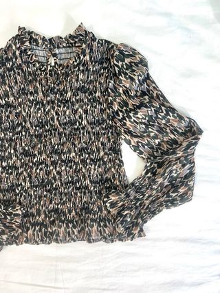 Blusa de manga larga con un estampado animal print y detalles brillantes. El cuello es alto y fruncido con un cordón para ajustar. - Diseño con múltiples estampados. - Tejido ligero y con brillo.