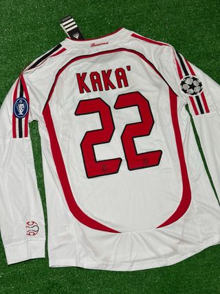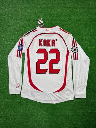 Camiseta de fútbol de manga larga del AC Milan, dorsal 22 de Kaká. - Diseño con detalles en rojo y negro. - Escudo del AC Milan y logo de Adidas. - Parche de la Champions League.