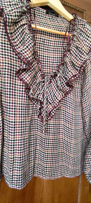 Blusa de Zara con estampado de cuadros. - Diseño con volantes en el escote. - Cierre de lazada. - Mangas largas abullonadas.