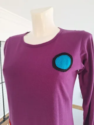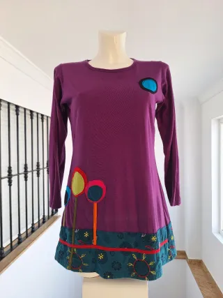 Camiseta de manga larga con un diseño original y colorido. Detalles de apliques de estilo bohemio. Talla S/M 100% algodón MEDIDAS: - Pecho (contorno): 94 cm - Cintura (contorno): 86 cm - Cadera (contorno): 98 cm - Largo: 74 cm - Manga: 54 cm - Hombro: 37 cm