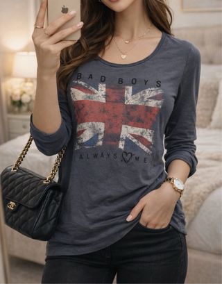 Camiseta gris con bandera de Only. Muy poco uso, por lo que está en muy buen estado. Largo de manga ajustable. Es una talla S, pero sirve también para una talla M.