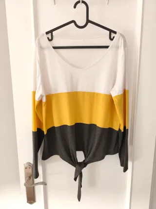Camiseta de manga larga con un diseño moderno y llamativo. - Tres bloques de color: blanco, amarillo y gris. - Cuello en V. - Detalle anudado en la parte delantera.