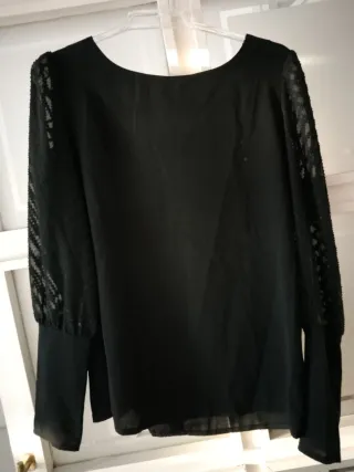 Camiseta elegante de color negro con un diseño moderno. - Mangas largas con detalles transparentes - Puños y cuello de tela lisa.